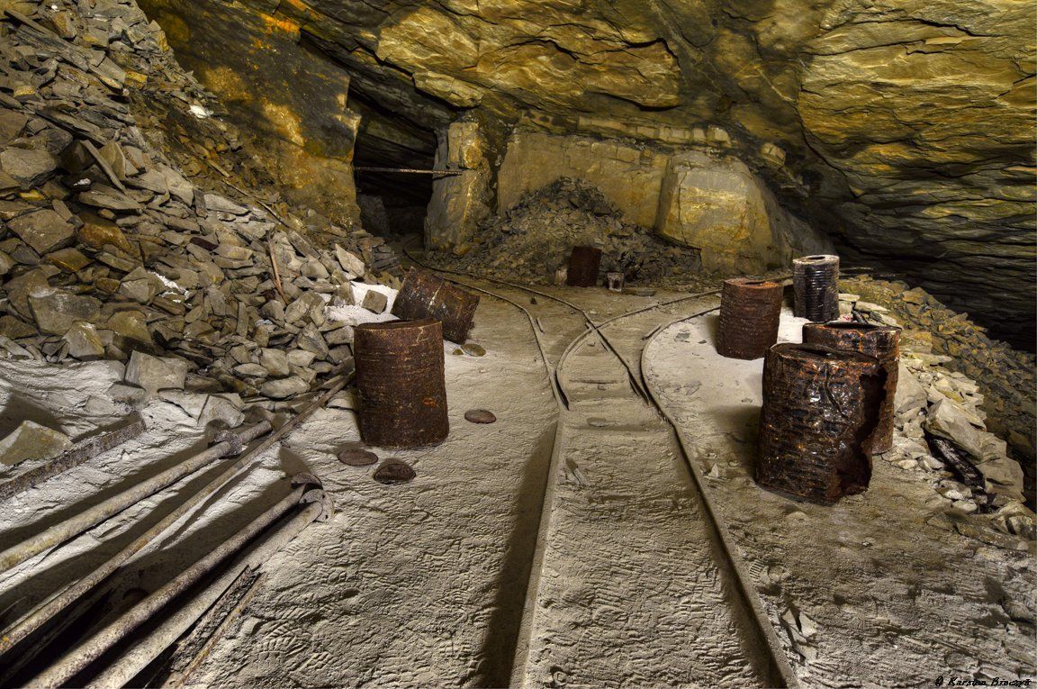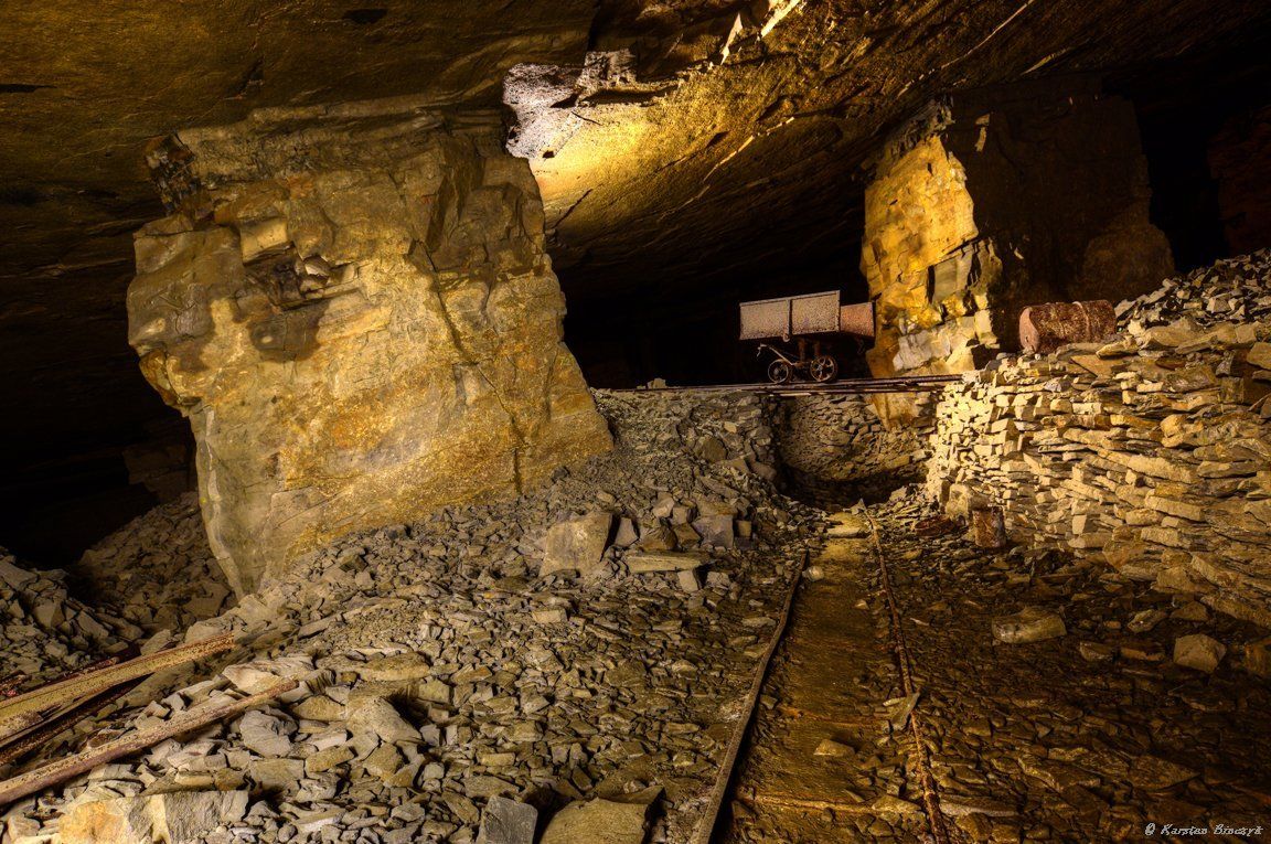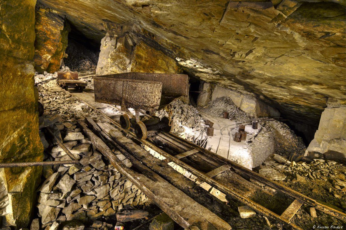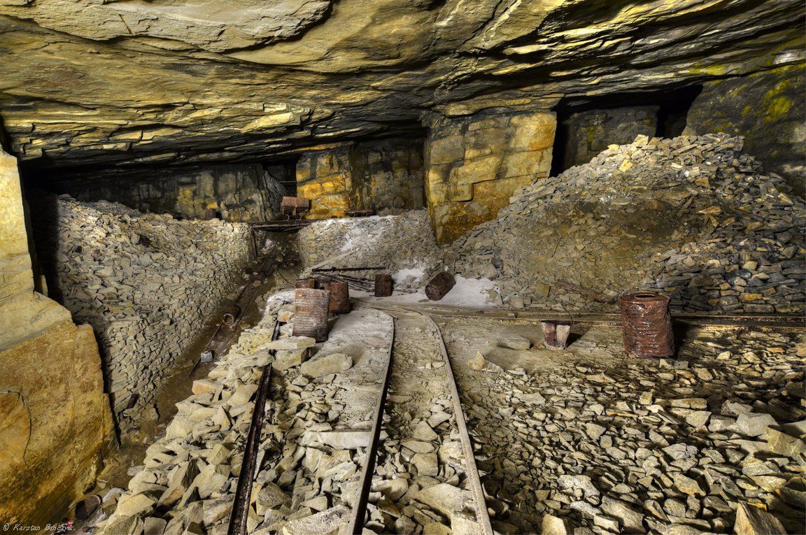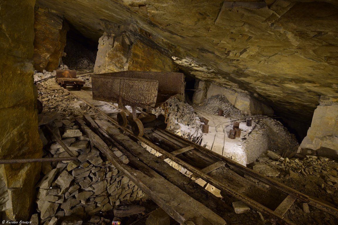 Wir waren mit einem Fledermausschützer unterwegs. Er zeigte uns einen unterirdischen Steinbruch wo bis etwa in die 1960 Jahre zb. Kopfsteinpflaster gewonnen hat. Übertage fallen nur im Herbst alte Stationen auf, wo man mit der Hilfe von Elektrobetriebenen Motoren über eine Haspel, Grubenwagen mit der Hilfe von einem sehr langen Drahtseilen aus der Tiefe der Erde gezogen hat. Fast 45 Grad steil sind die Eingangsstollen in die Tiefe. Mehrere 100 Meter steigen wir ab. An der First sehen wir alte Isolatoren aus Glas die einst Strom hier herunter brachten. Der Abbau von Steinen erfolge hier in Großen Kammern. Alle spaar Meter wurden große Stützpfeiler stehen gelassen. Nun Tauchten im Schein unserer Lampen die ersten Überbleipsel der letzten Betriebszeit auf. Alte Kipploren auf Schienen. Wir packten unsere Ausrüstung auf einer diese und schoben sie auf einen intakten Gleisbett durch die Unterwelt. Weiter tauchten wiederum andere Loren auf. Eine Schienenbiegemaschiene gut gefettet, ein Dutzend leere Karbitbehälter die einst den Brennstoff trocken hielten für die Handlampen der Arbeiter unter Tage. Bohrstangen, Bohrhämmer, Trinkflaschen und vieles mehr zeigte uns der freundliche Herr. Die tiefen teile des Steinbruchs standen unter glasklarem Wasser. Mit der Zeit wurde auch hier Müll von oben eingefüllt, aber das hält sich in Grenzen. Ohne gutes Schuhwerk ist hier nichts zu machen. Nach einer Zeit standen wir vor einem weiteren Gang der in die Tiefe führte. Mindestens 40 Blechfässer lagen davor. Wo es dort hin geht wissen wir nicht zu niedrig war die Stollenhöhe. Diese Aufnahmen brachten wir mit.